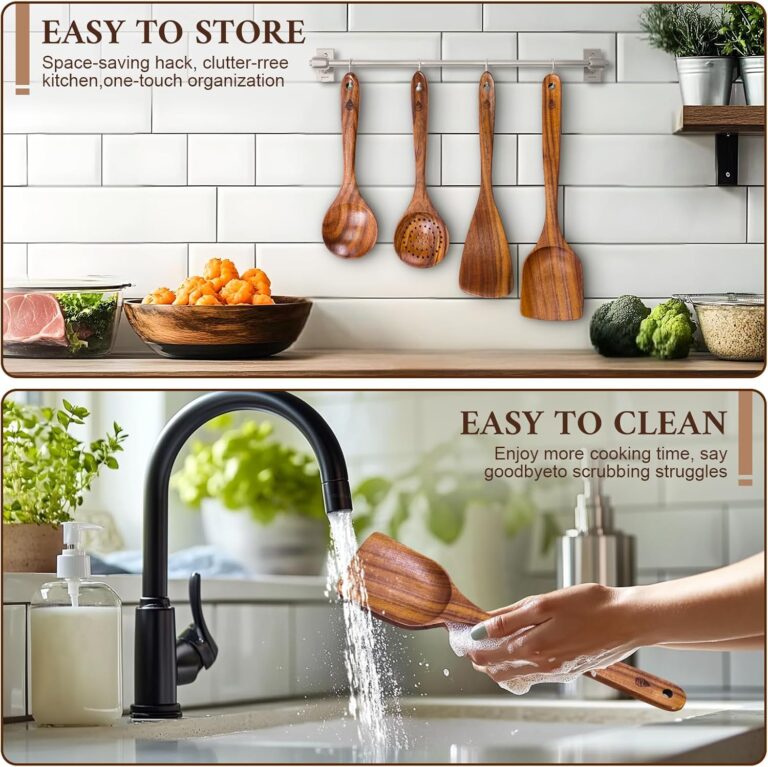 If you are looking for simple and durable wooden kitchen utensils for everyday use this teak wood set is a reliable option.