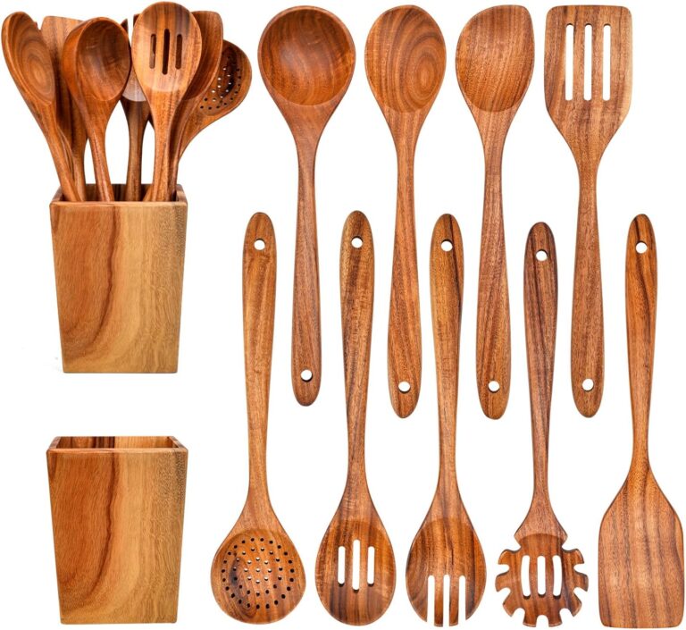 If you want a complete and reliable wooden kitchen utensils set this 12-piece teak wood set is a great option for everyday cooking.